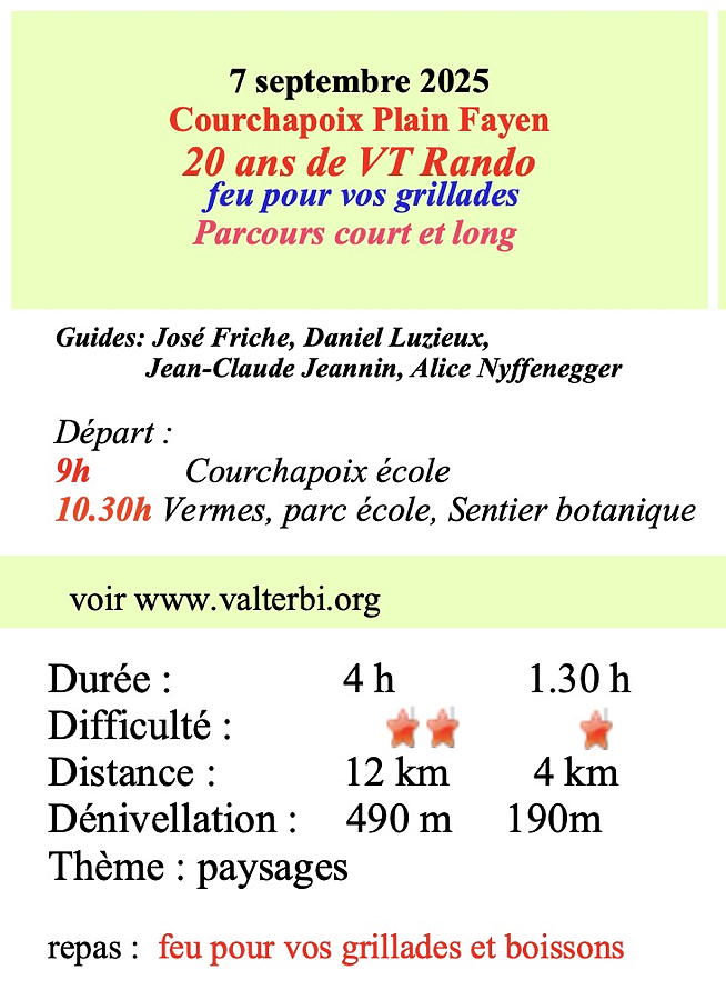 Les 2 courses, longue et courte, se rejoignent au chalet de Plain Payen, au bout du sentier botanique de Vermes, pour partager les souvenirs autour d’un feu pour vos grillades. Boissons sur place.